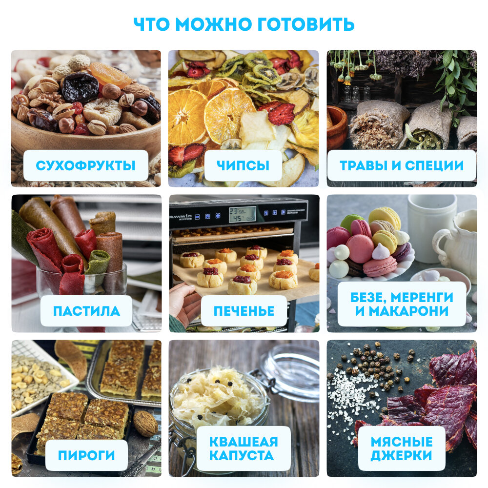 1) Не смотря на то, что цена немного выше, чем на модели, которые сушат или мясо /рыбу или фрукты/овощи -, здесь можно сушить всё! Даже травы, чеснок, лук и тд. 2) Удобно использовать для приготовления пастилы. 3) Монитор находится сверху и на нем всё популярно нарисовано : что и как сушить, температура и время. 4) Есть отдельные лотки для сушки пастилы. 5) 10 поддонов. 6) Достаточно тихо работает (сушили ночью). 7) Есть книга с подробными рецептами от трав до мясных вкусняшек. |