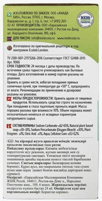 MOLECOLA Экологичный стиральный порошок с растительными энзимами для белого белья и одежды 1,2 кг