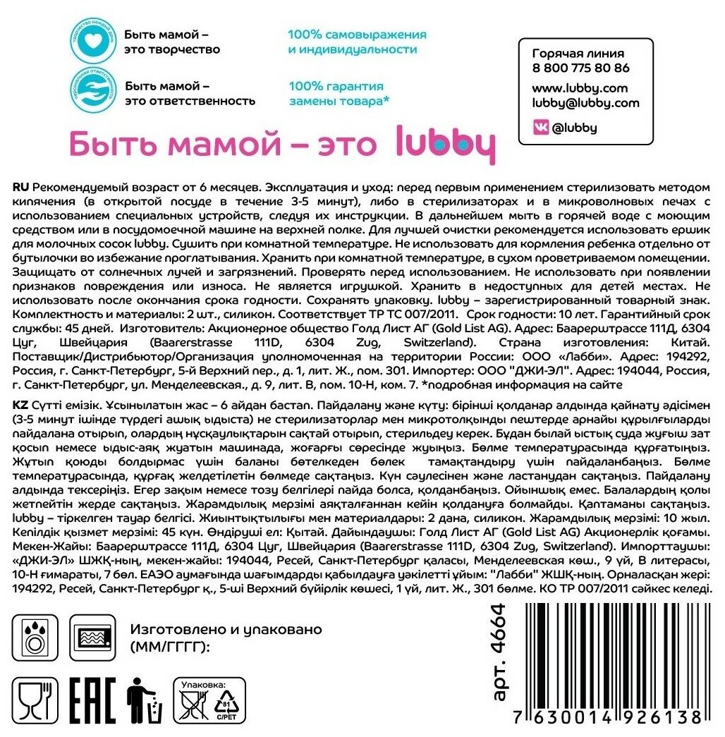 Lubby Соска силиконовая размер -Х для густых жидкостей 2шт 6+ интересное: