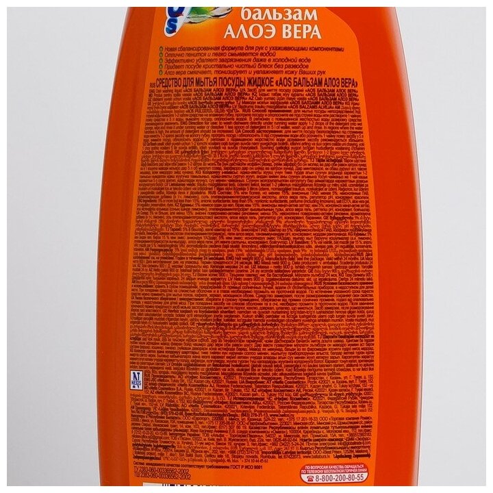 Средство для мытья посуды AOS "Бальзам Алое вера", 900мл