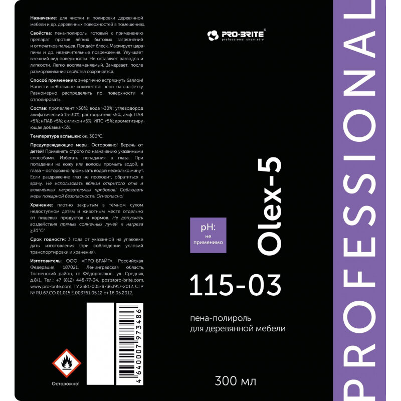 Полироль-пена для деревянной мебели Pro-Brite Olex-5 Professional 300мл аэрозоль арт.115-03 (Ст.20)