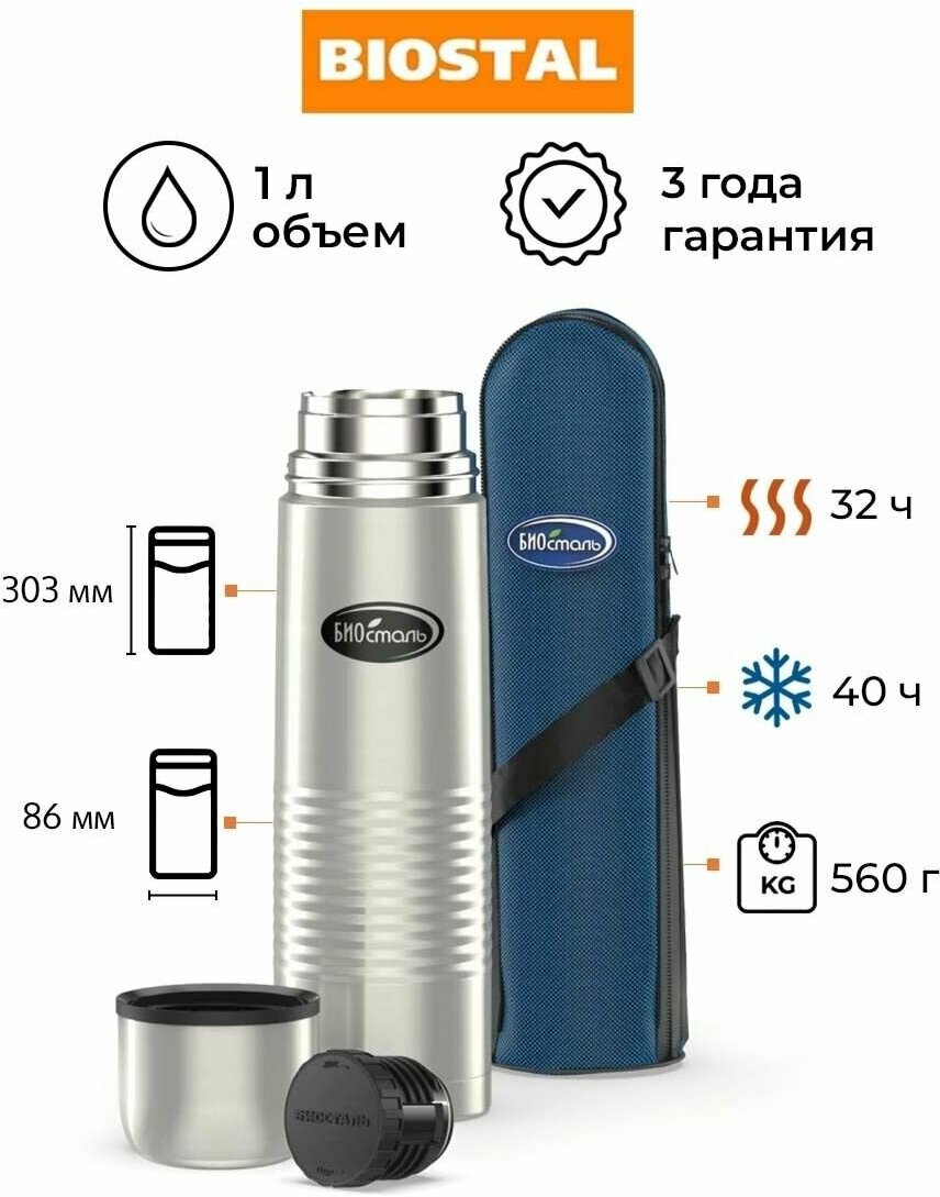 Термос биосталь с узкой горловиной, в чехле, 1.0 л. NB-1000 B