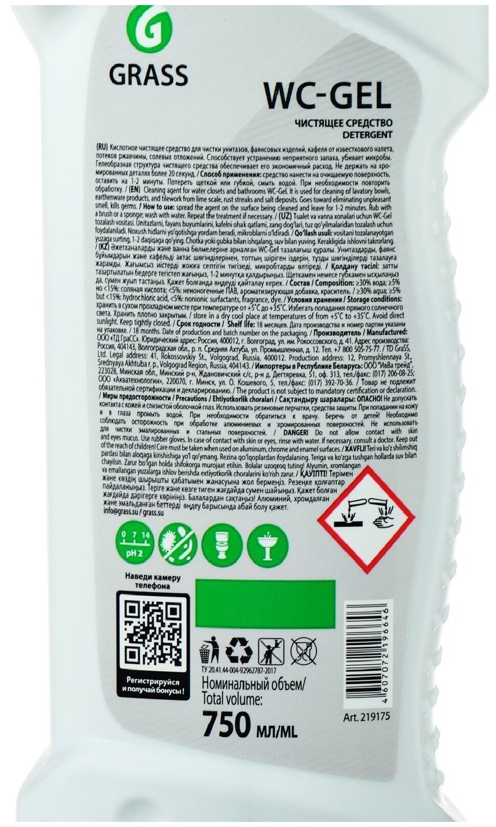 Grass Средство чистящее "WC-GEL" для чистки унитазов, кафеля, фаянса, Кислотное, 750 мл