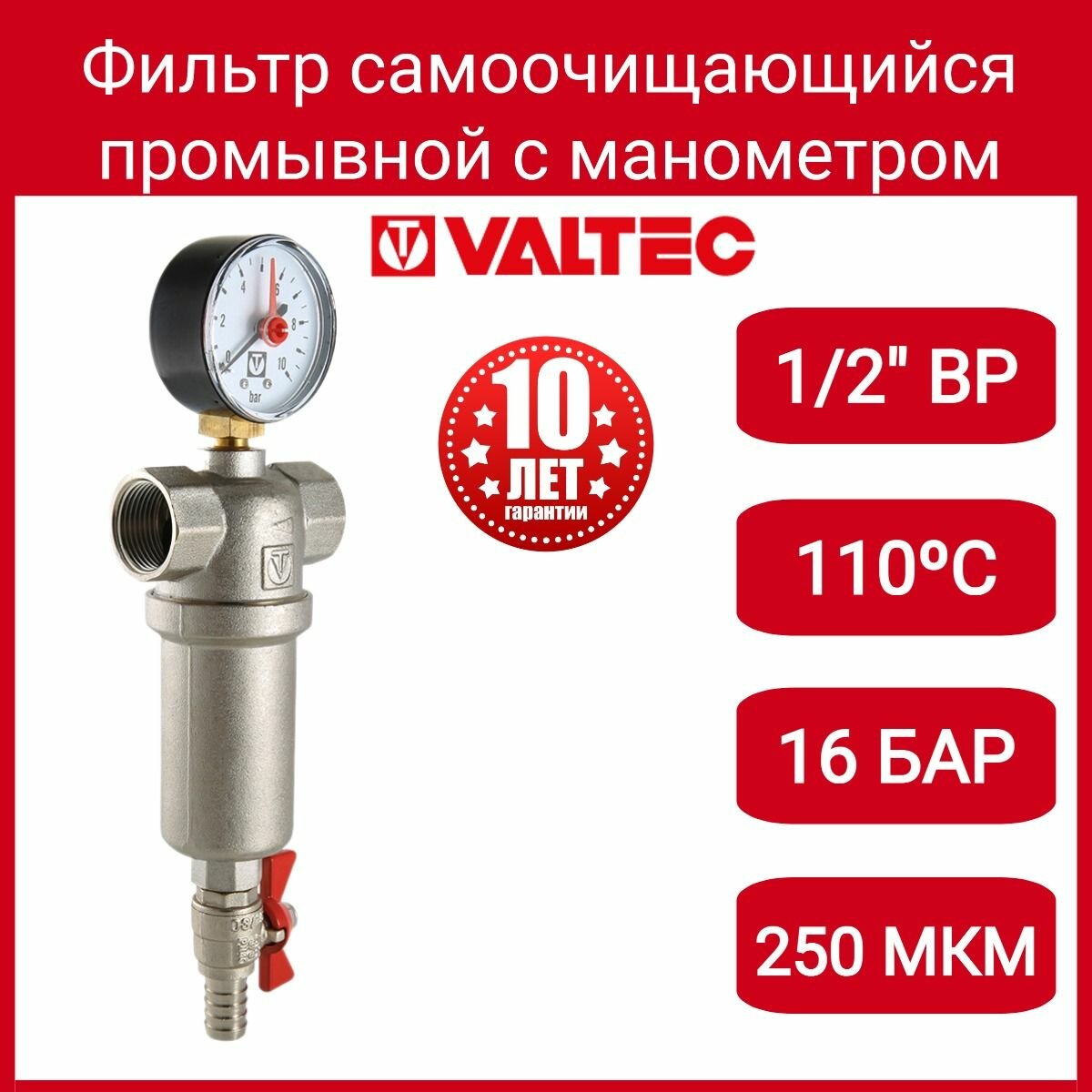 Фильтр тонкой очистки промывной VALTEC VT.389 - 3/4" (ВР/ВР, 250/1000 мкм, PN16, 110°C, манометр)