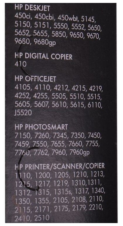 | Модель совместимого принтера | 1210 / 1213 / 1215 / 1216 / 1315 / 1350 / 2105 / 2110 / 2175 / 2210 / 2410 / 4110 / 4251 / 4256 / 5150 / 5550 / 5610 / 5655 / 6110 / 7350 / 7450 / 7660 / 7760 / 7762 / 7960; PSC 1110 / 9650; Officejet 4105 / Deskjet 450 / J5520; PhotoSmart 7260 |