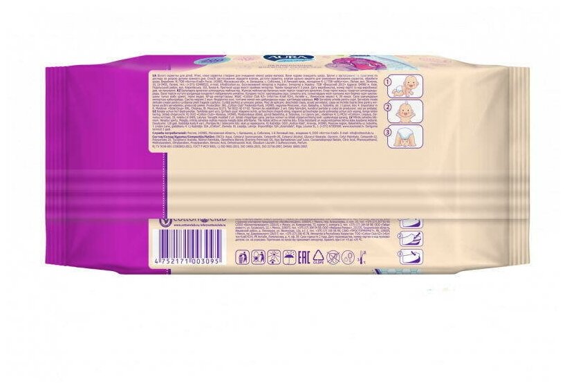 Салфетки влажные Aura 100 шт, для детей "Ultra comfort", очищающие гипоаллергенные, без спирта