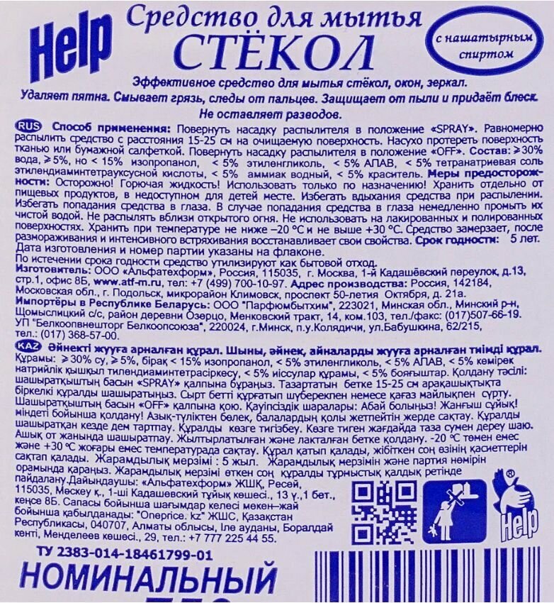 Купить Средство д/стёкол HELP 750мл Нашатырный спирт курок