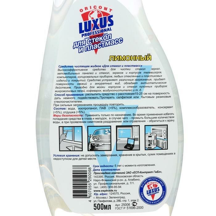 Купить Luxus Professional Чистящее средство для стекол и пластмасс Лимонный с антистатиком 500 мл с распылителем
