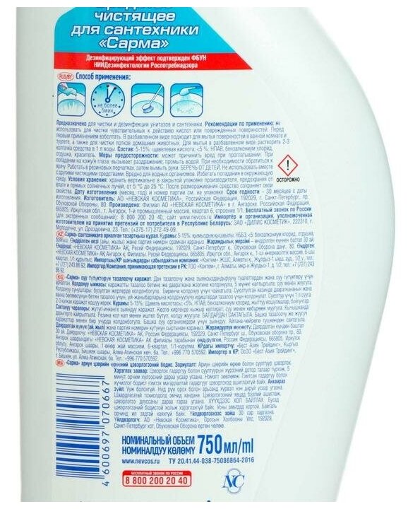 | Отзыв: | Давно использую, когда впервые воспользовалась сармой просто влюбилась. Никакого запаха хлорки или другого едкого запаха нет, отличные чистящие свойства. |