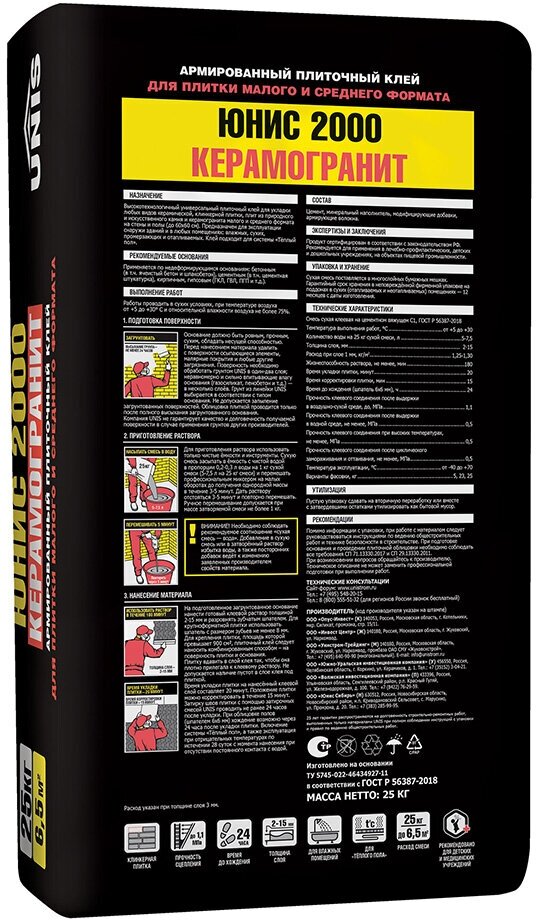 Юнис 2000 клей плиточный (25кг) / UNIS 2000 клей для плитки и камня (класс С1) (25кг)