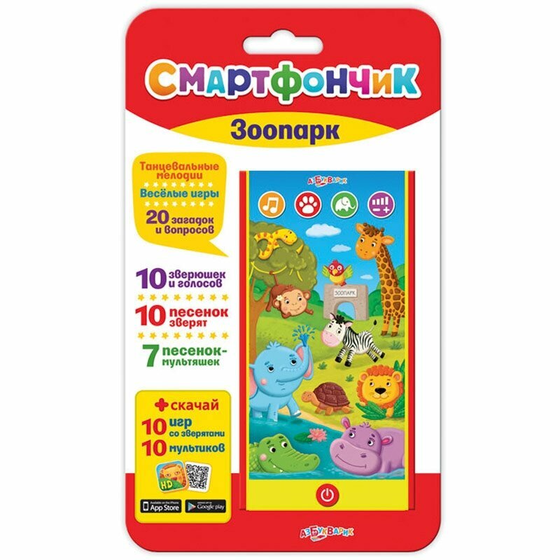 Смартфончик, Азбукварик, "Зоопарк" 20 загадок и вопросов, 10 зверюшек и голосов, 10 песенок зверят, 7 песенок мультяшек