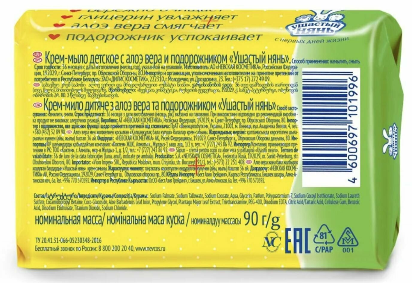 Невская косметика Ушастый нянь Крем-мыло детское с алоэ вера и подорожником, 90 г. 6 шт.