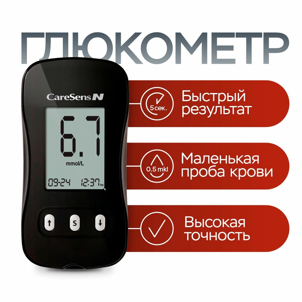 Глюкометр CareSens N (КеаСенс Н). В наборе: тест-полоски 10шт, ланцеты 10шт, 1 ручка-прокалыватель, чехол, журнал учета, инструкция интересное: