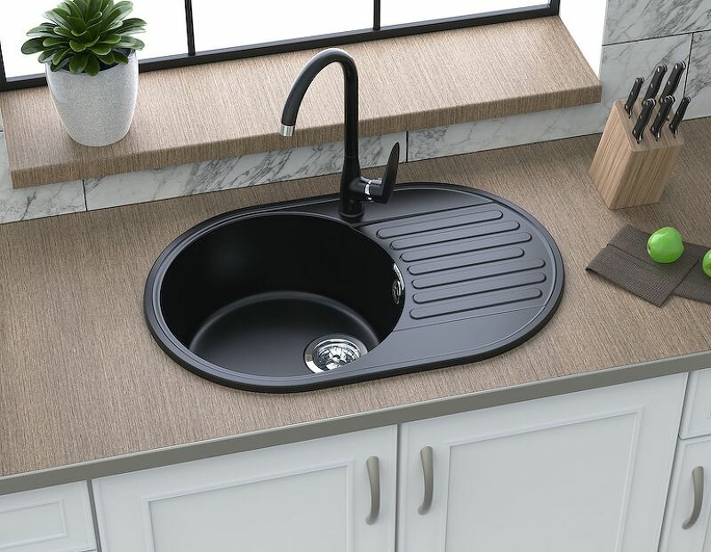 Кухонная кварцевая мойка GranFest QUARZ 18, овал, врезная, цвет черный/Раковина для кухни