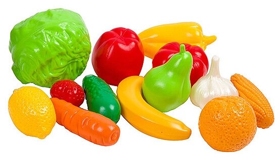 | Плюсы: | Фрукты и овощи склеены из 2х половинок, но все швы хорошие, игрушки на 2 части не распадаются. Пластик плотный, практически не продавливается пальцами,ничем не пахнет.