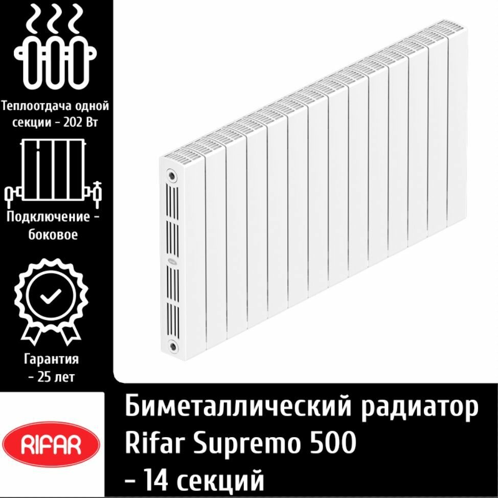 Купить Радиатор биметаллический Rifar SUPReMO 500, 14 секций, боковое подключение, цвет белый