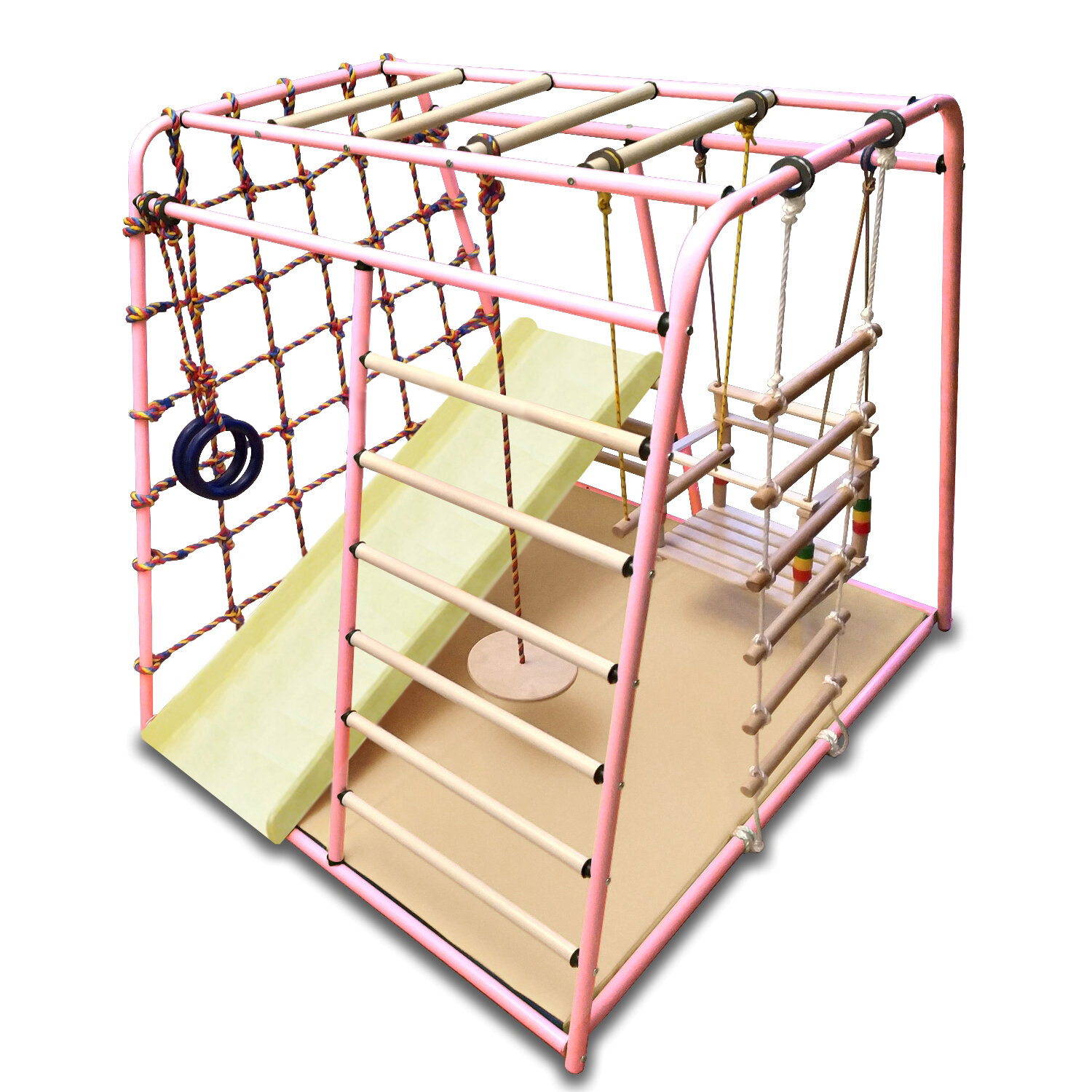| Плюсы: | Приятный внешний вид, можно было выбрать из 3 цветов, устойчивый, быстрая доставка, в комплектации много всякой всячины ( качели, тарзанка, лесенка веревочная, кольца гимнастические, кольца для счета, горка, мат, веревочная стенка).