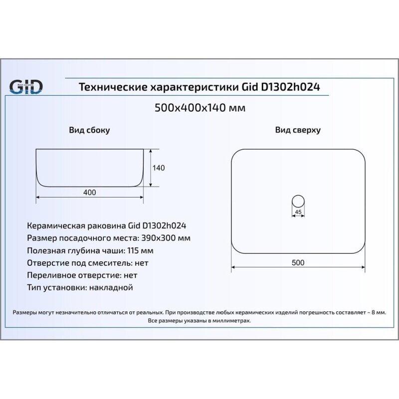 GID Раковина накладная Gid D1302h024