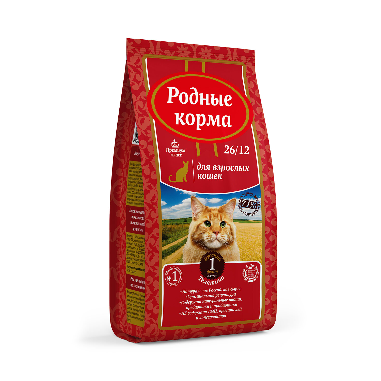 Cухой корм для взрослых кошек с телятиной, родные корма 26/12, 5 русских фунтов, 2,045 кг