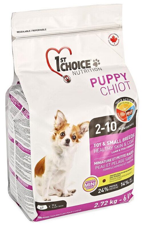 Корм 1st Choice PUPPY Toy & Small Breeds, Healthy Skin & Coat для щенков декоративных и малых пород, для кожи и шести, с ягненком и рыбой, 2.72 кг