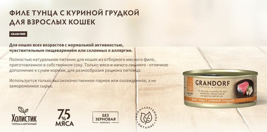 СохранитьGrandorf влажный корм для взрослых кошек всех пород, филе тунца с куриной грудкой (6шт в уп) 70 гр интересное: