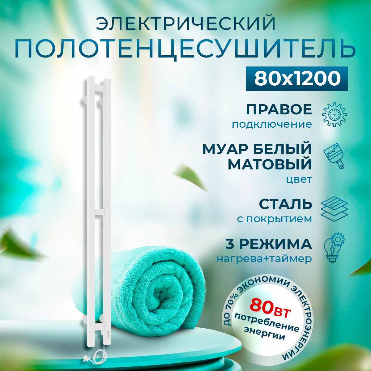 Купить Узкий полотенцесушитель электрический белый Laris Прайм Дуэт ЧК 80х1200 Э правое подключение