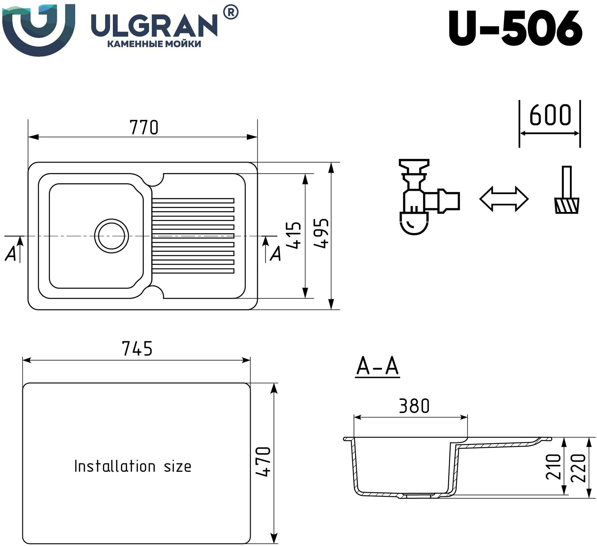 Мойка Ulgran, мрамор, U-506-310, (770*495*210 мм), серый, сифон и сливная арматура