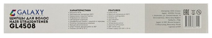 GALAXY GL 4508 Щипцы для волос 60 Вт, максимальная температура 200°, керамическое покрытие пластин, инфракрасное излучение, светодиодная индикация, нагревательный элемент с защитой от перегрева, регулятор температурных режимов, функция автоотключения, шну