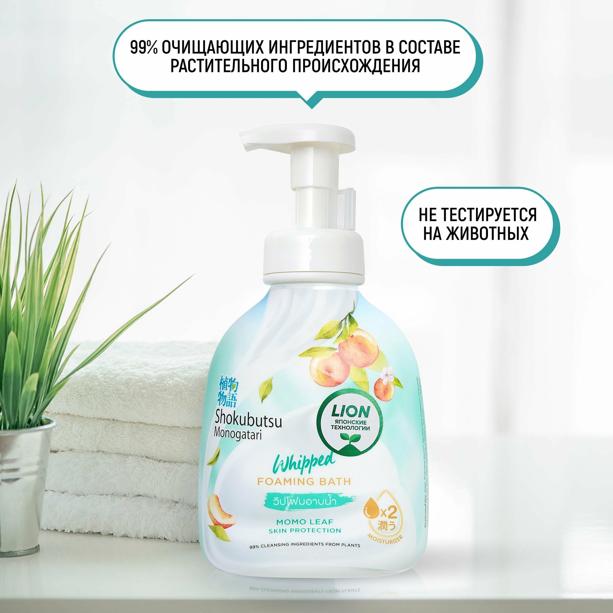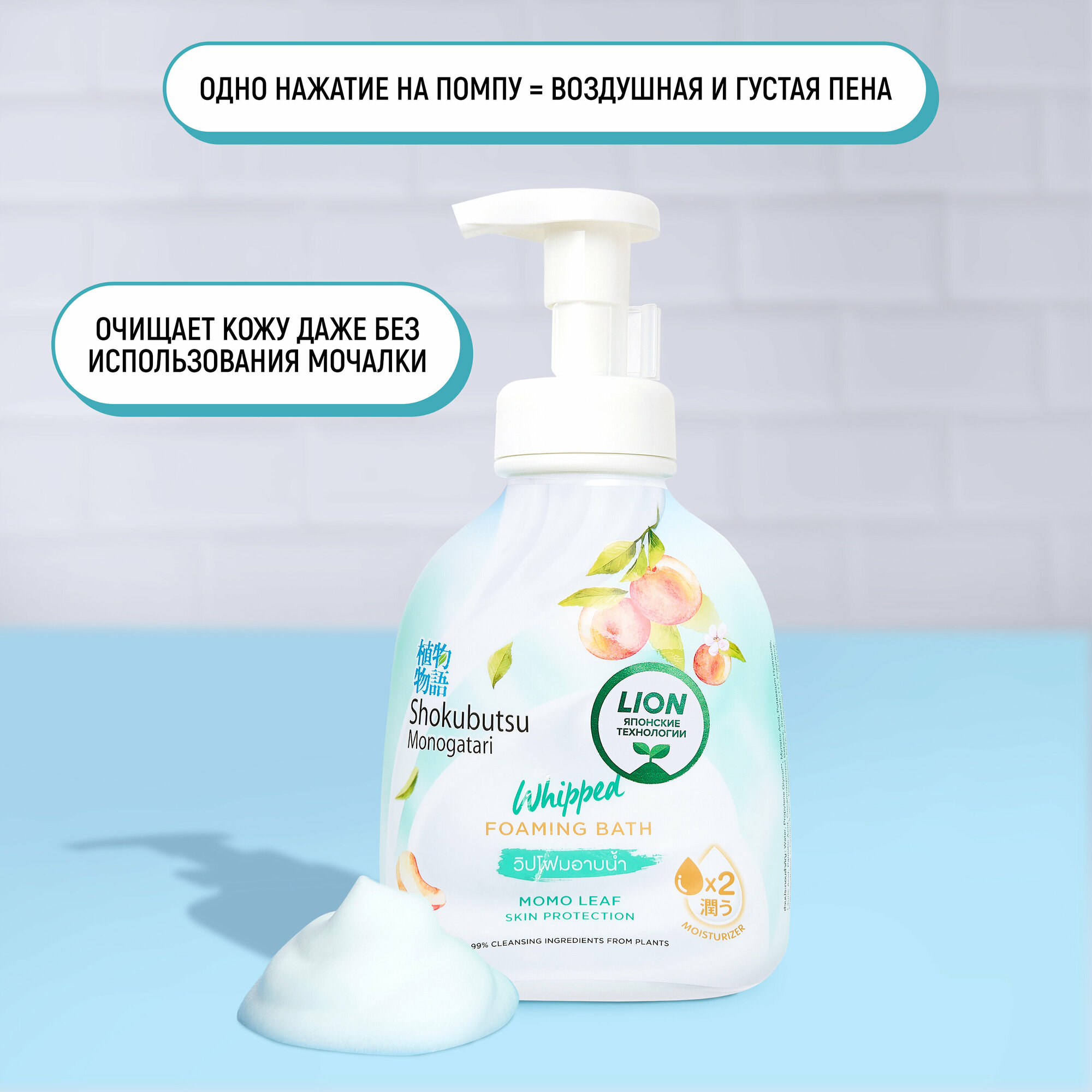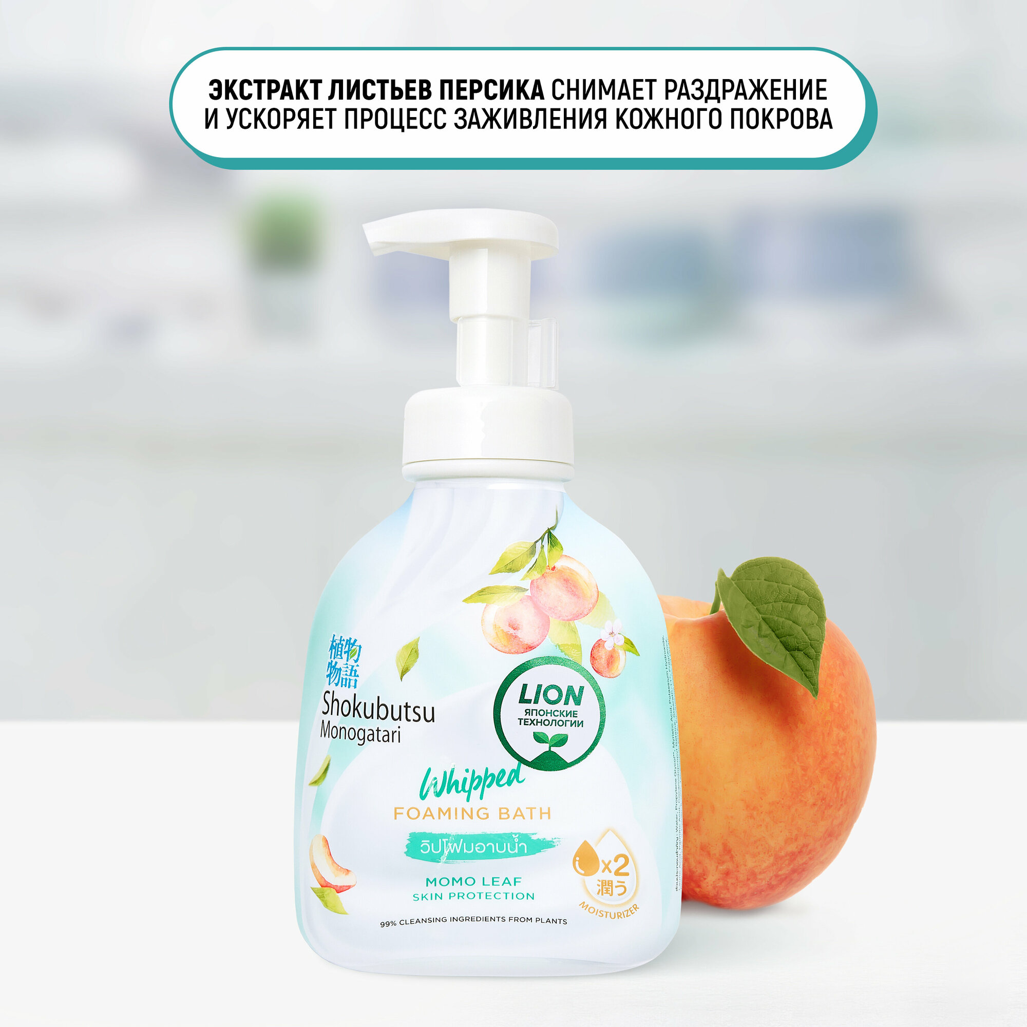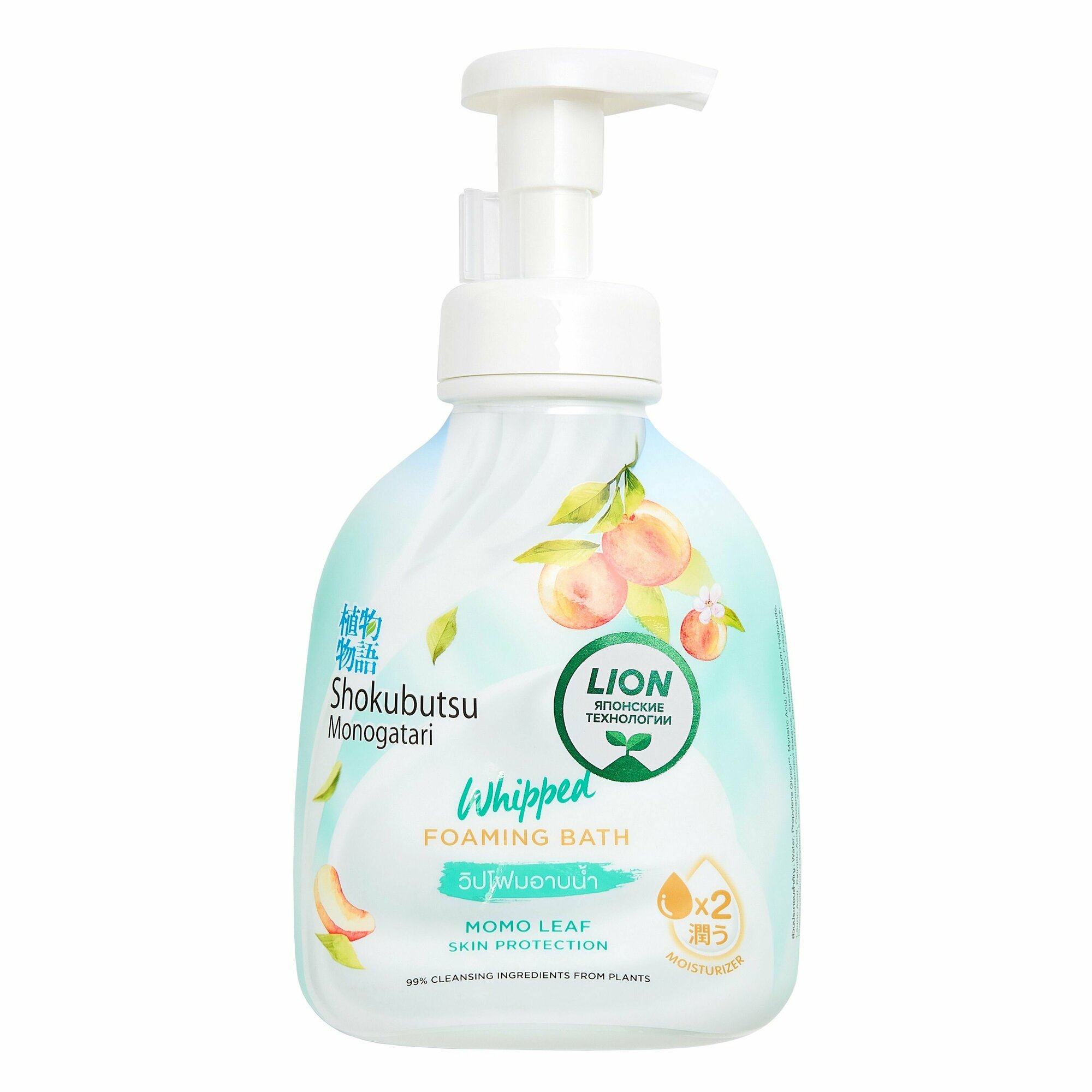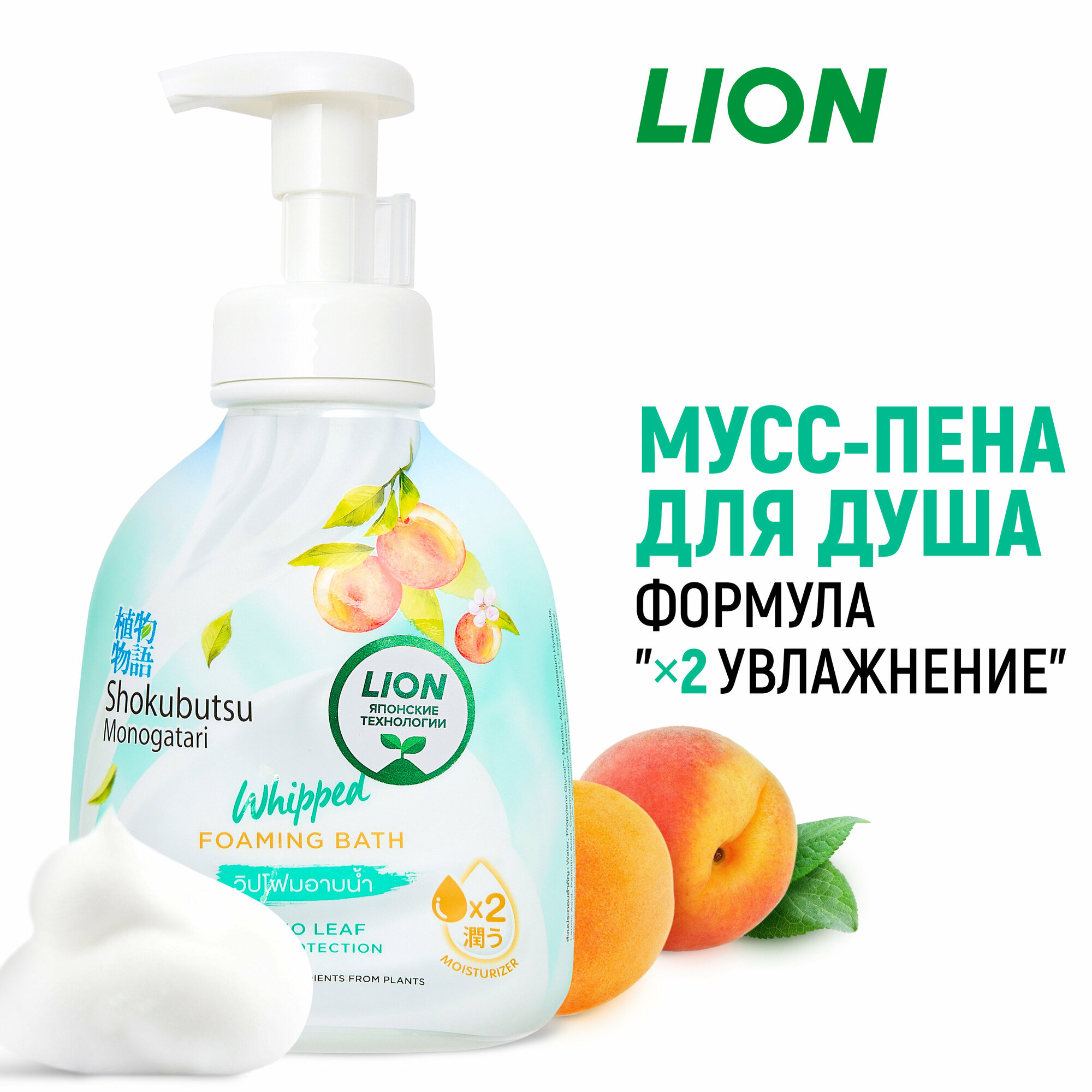 LION Shokubutsu Гель-пена для душа увлажняющая с натуральным экстрактом листьев Момо (персика) c дозатором, 450 мл