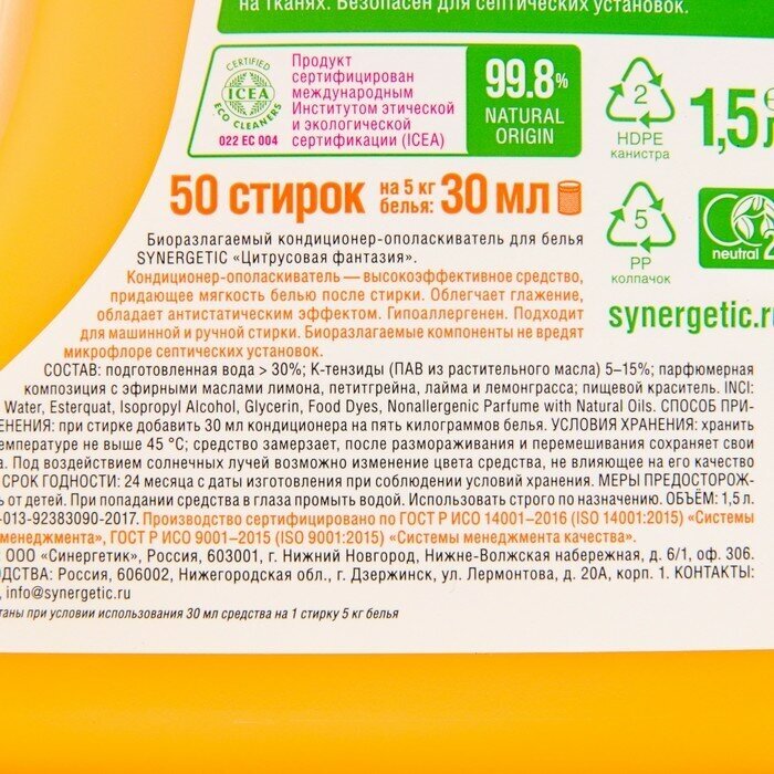 Купить Кондиционер для белья SYNERGETIC 1500мл кондиционер-ополаскиватель для белья Цитрусовая фантазия