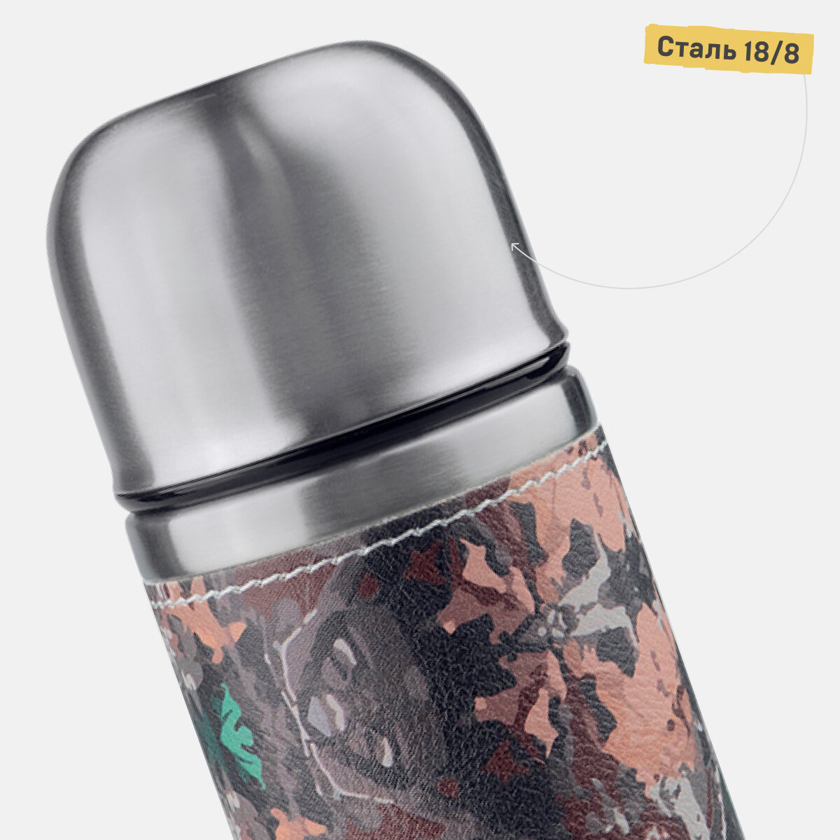 Термос для чая и кофе Арктика 108-500 милитари 0,5 литров в кожаной оплетке с кнопкой и чашкой