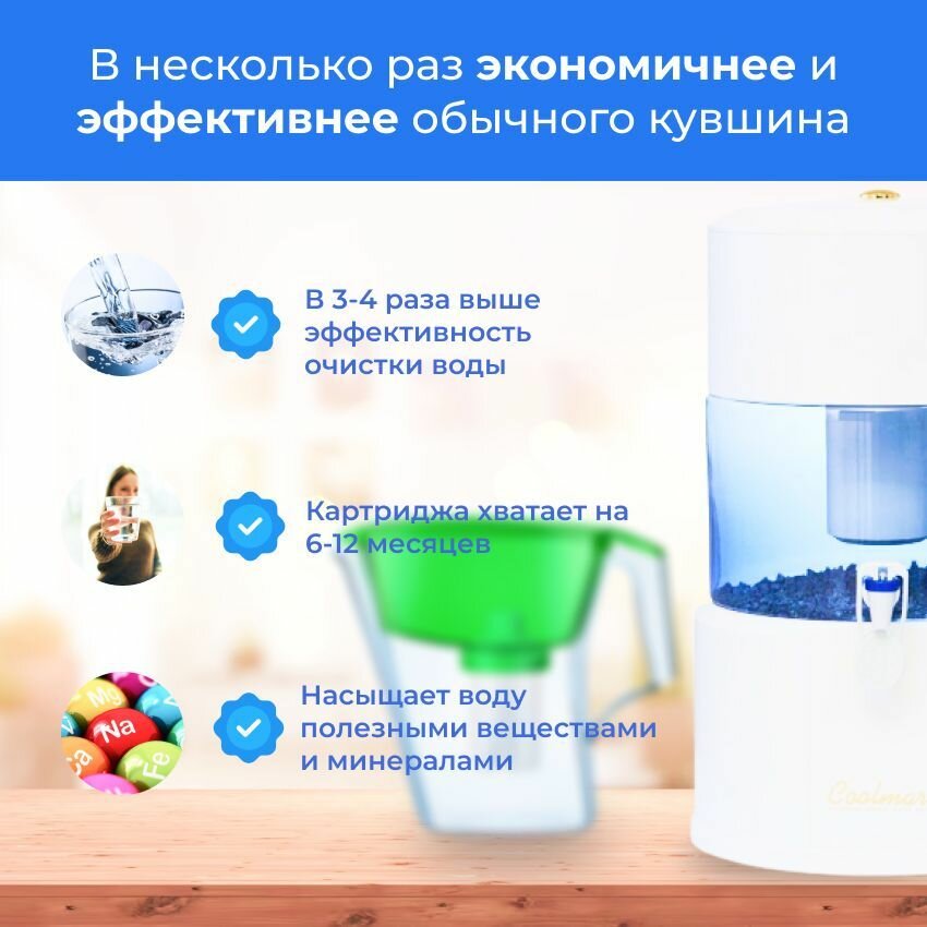 | Плюсы: | Кулмарт - супер фильтр. Вода - наивкуснейшая! Наша семья избалованна проживанием за границей, где все покупают питьевую воду в бутылках. Когда мы вернулись в Россию, встала проблема. Потому что здесь вся вода в бутылках не вкусная! И всегда есть вероятность наткнуться на подделку.