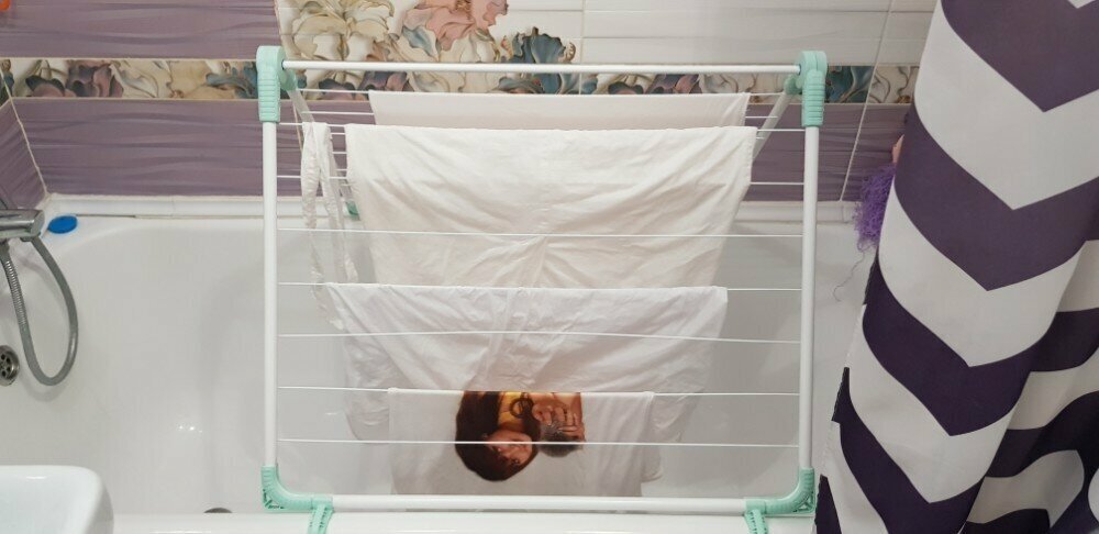 при сушке стоит на ванне - дополнительно не занимая места в квартире. крепил и на перила на балконе, и просто опирал на радиатор отпления. то, что нужно для маленькой квартиры |