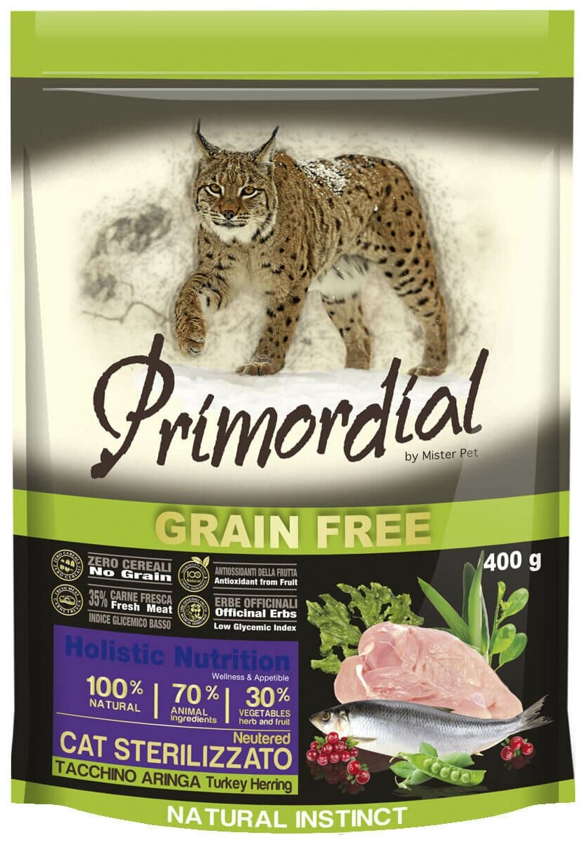 Купить PRIMORDIAL Беззерновой корм для стерилизованных кошек с индейкой и сельдью 64781 0,4 кг 34332