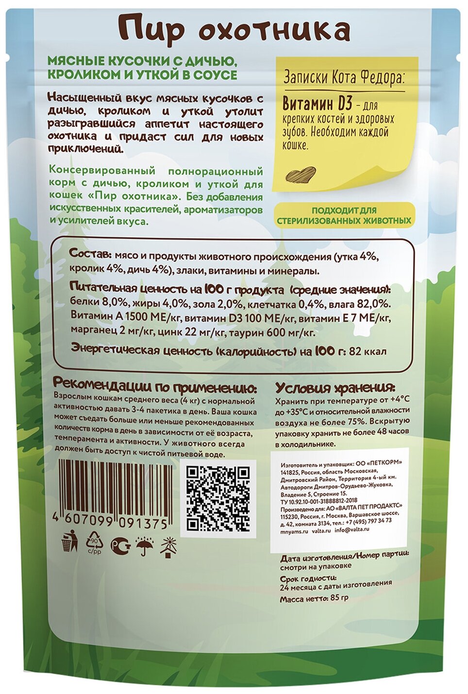 Мнямс "Пир Охотника" влажный корм для взрослых кошек мясные кусочки с уткой, кроликом и дичью, в паучах - 85 г х 12 шт (+12 шт В подарок)