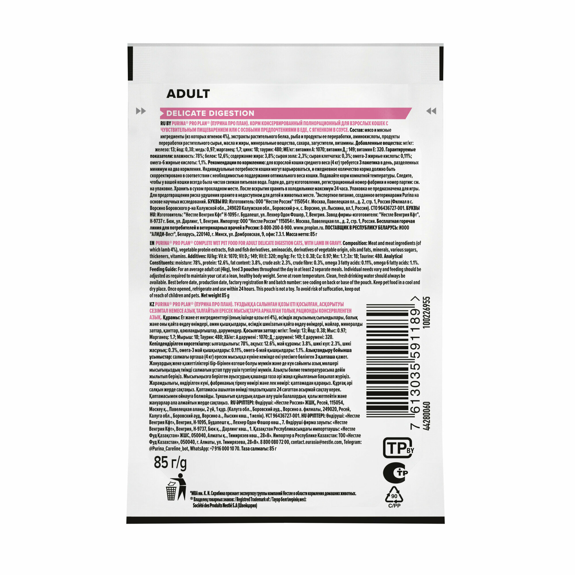 Влажный корм Pro Plan DELICATE для взрослых кошек с чувствительным пищеварением или особыми предпочтениями в еде, с ягненком в соусе, паучи, 85г.*12шт.