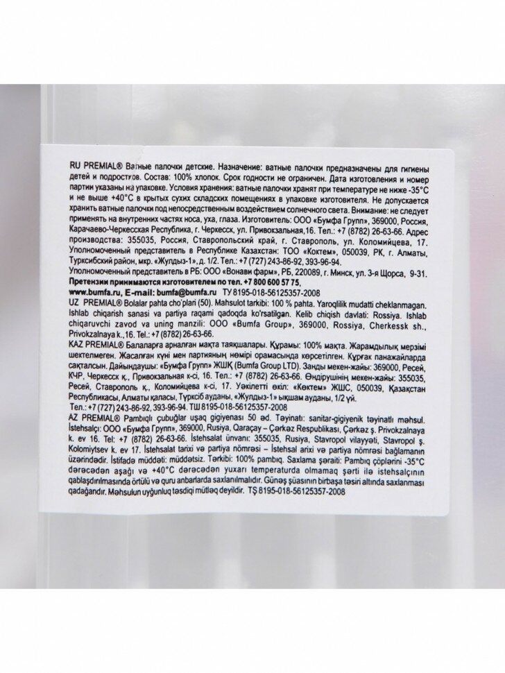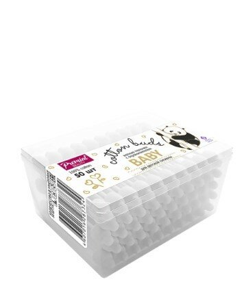 Ватные палочки для детской гигиены PREMIAL с ограничителем, 100% хлопок, 50 шт