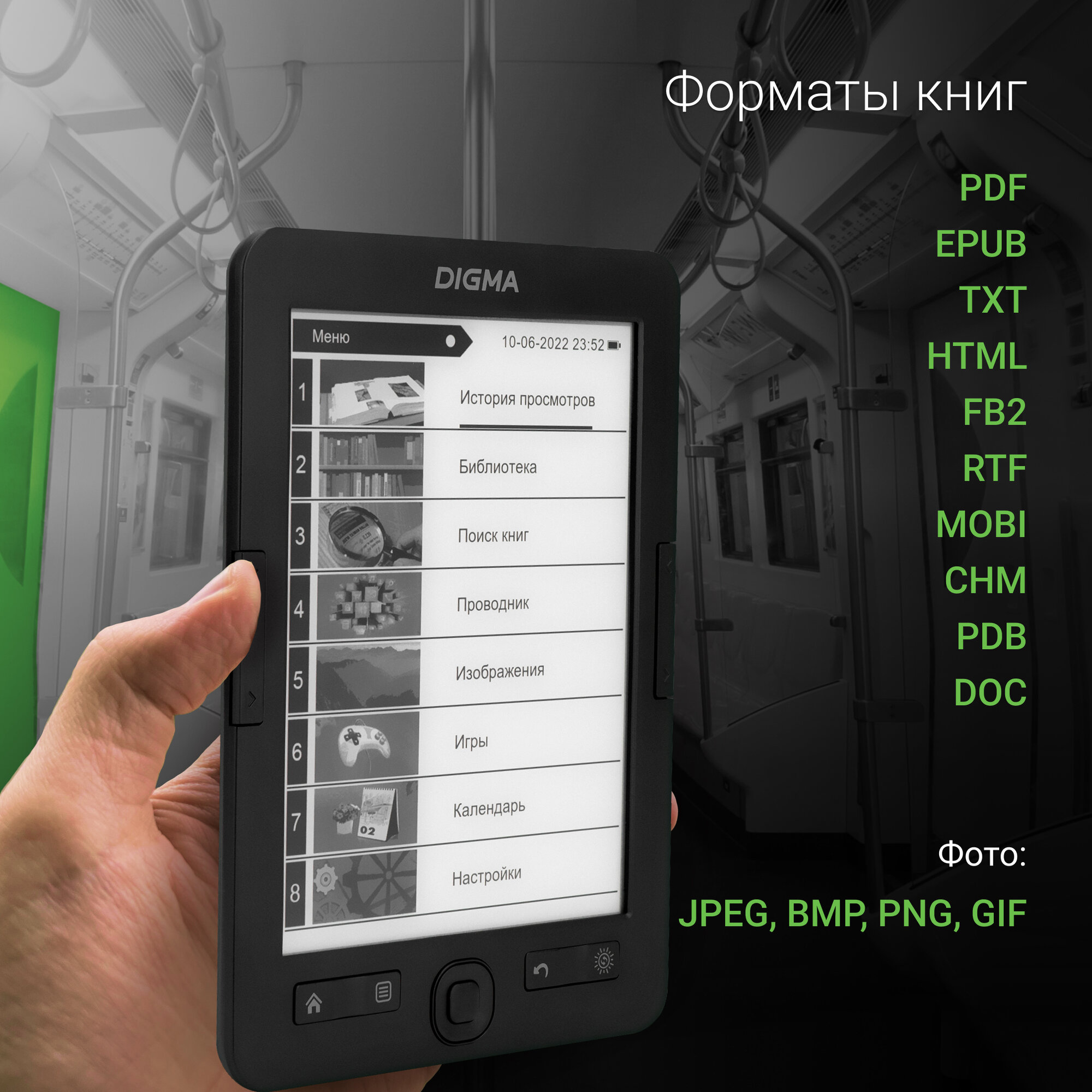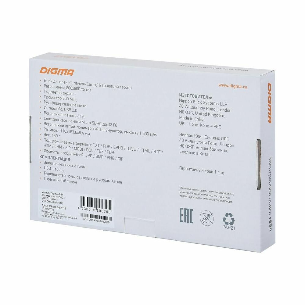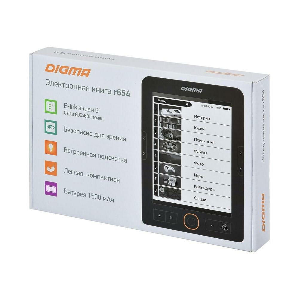 Digma R654 (6", mono,подсветка, 800x600,4Gb,FB2/PDF/DJVU/RTF/CHM/EPUB/DOC/JPG/BMP, microSDHC, Usb2 .