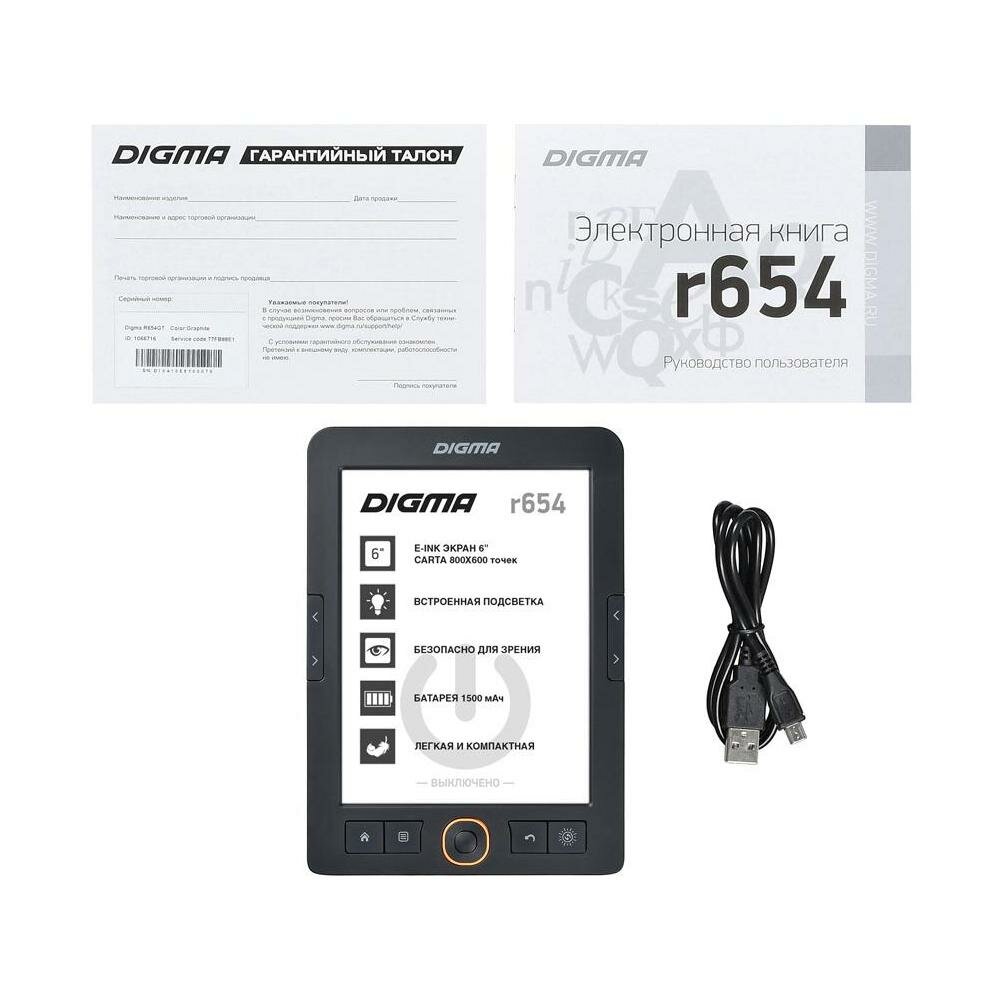 Электронная книга Digma R654 6" E-Ink Carta 800x600 600MHz/4Gb/microSDHC/frontlight графит