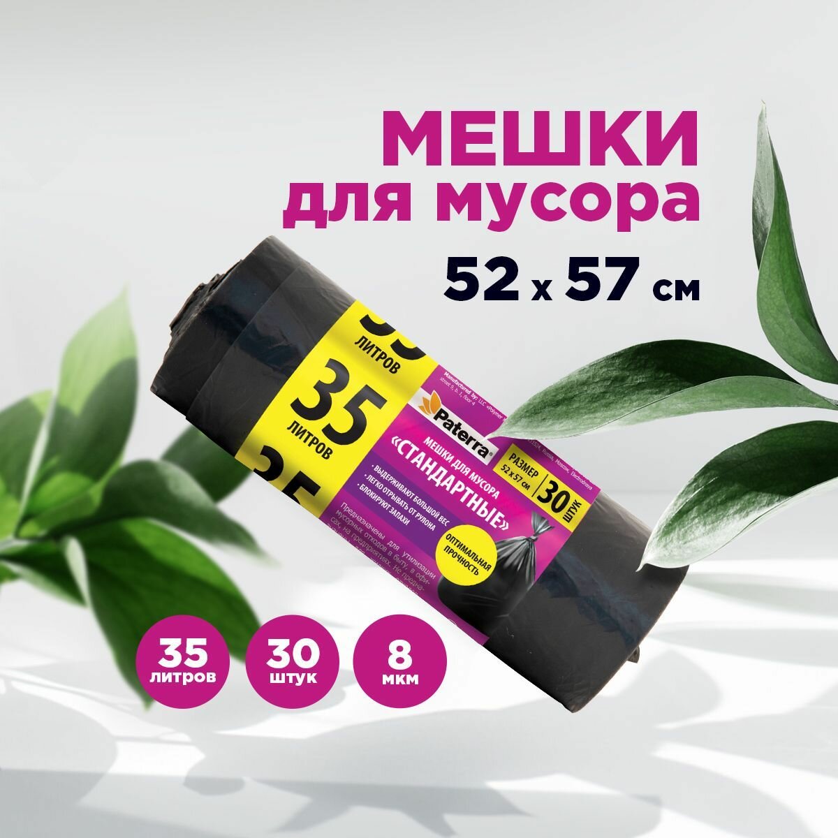 Мешки для мусора 35 л, PATERRA, черные, 8 мкм, 30 шт. в рулоне