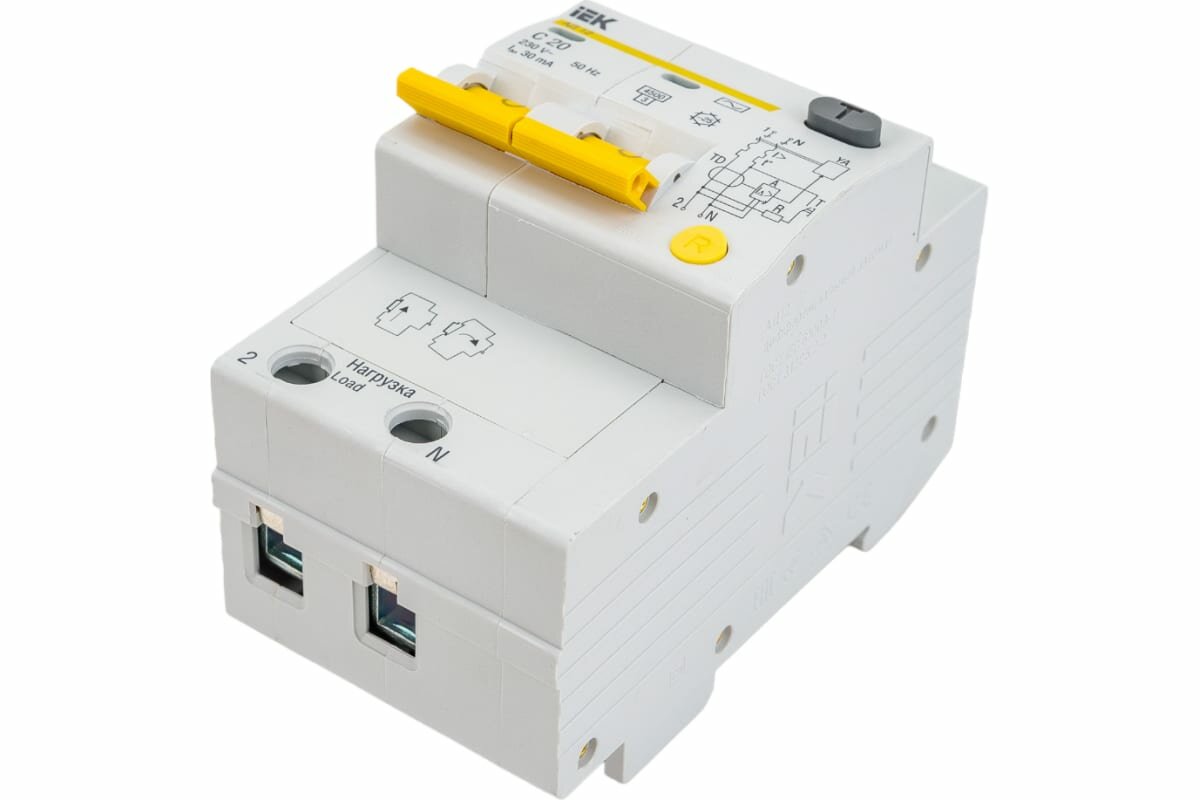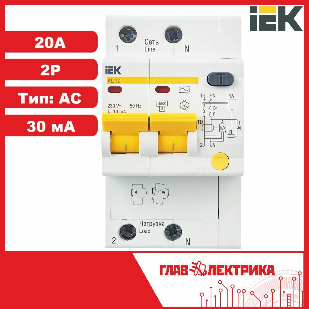 Дифференциальный автоматический выключатель двухполюсный IEK АД12 20А, 30мА, тип AC, характеристика C