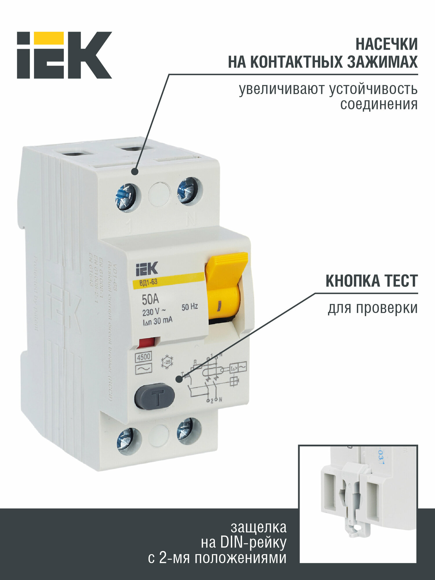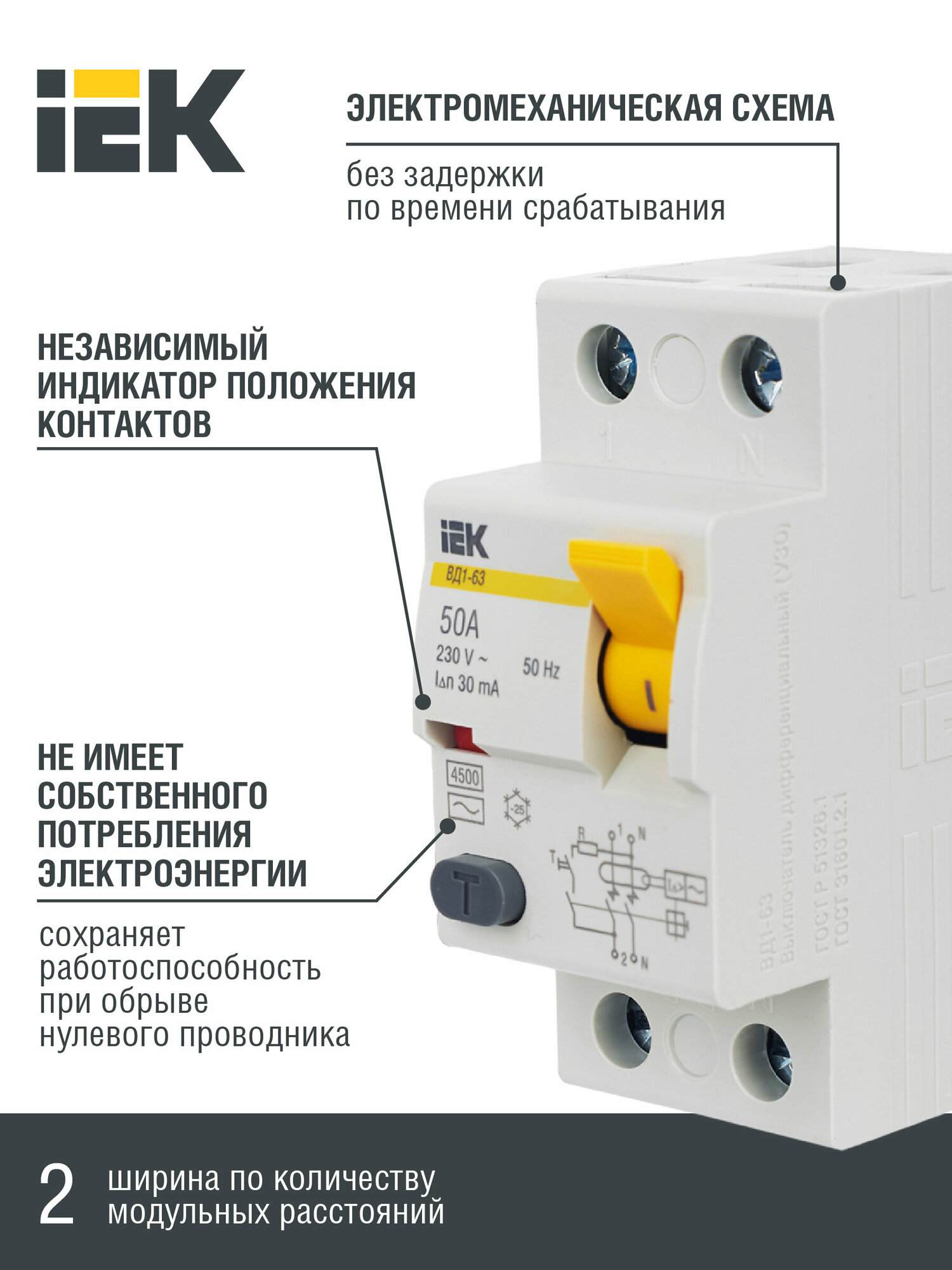 УЗО IEK ВД1-63 MDV10-2-063-030, дифференциальный, электромеханический, 63A, 30mA, 2 модуля