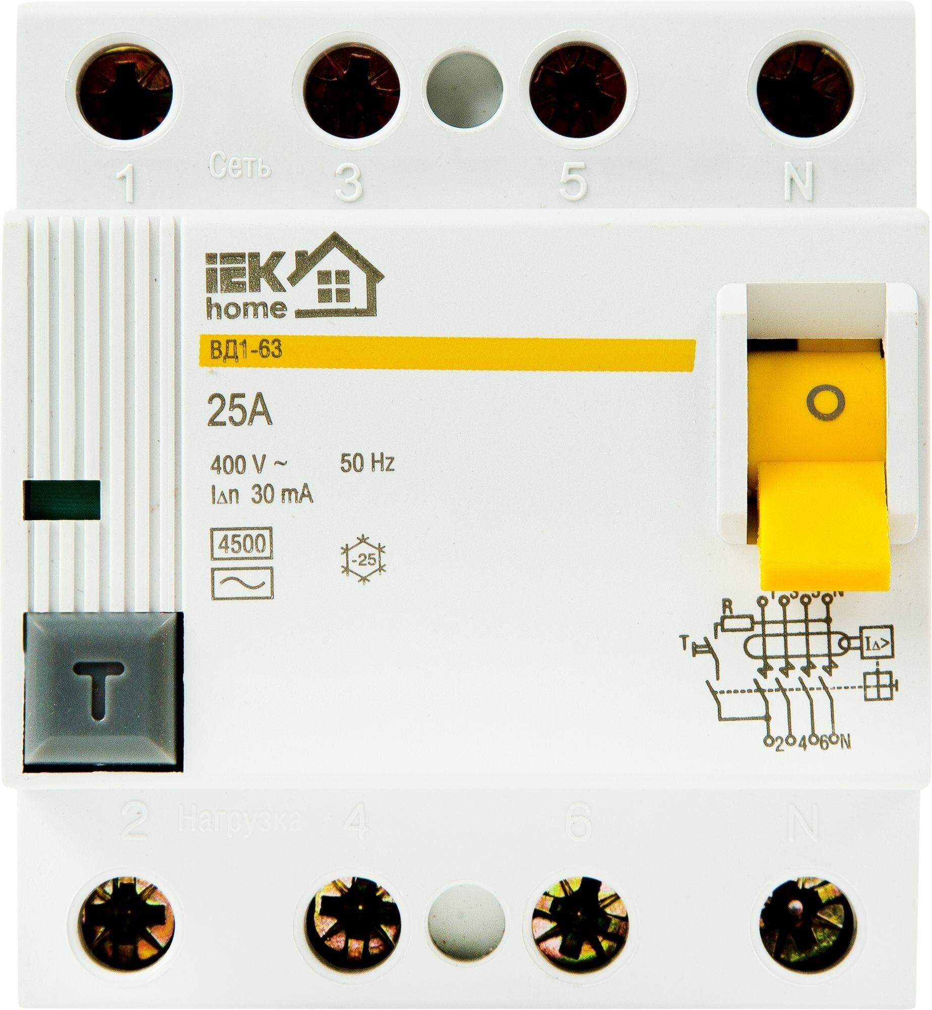 УЗО IEK Home ВД1-63 3P N 25 А 30 мА 4.5 кА AC MDV10-4-025-030