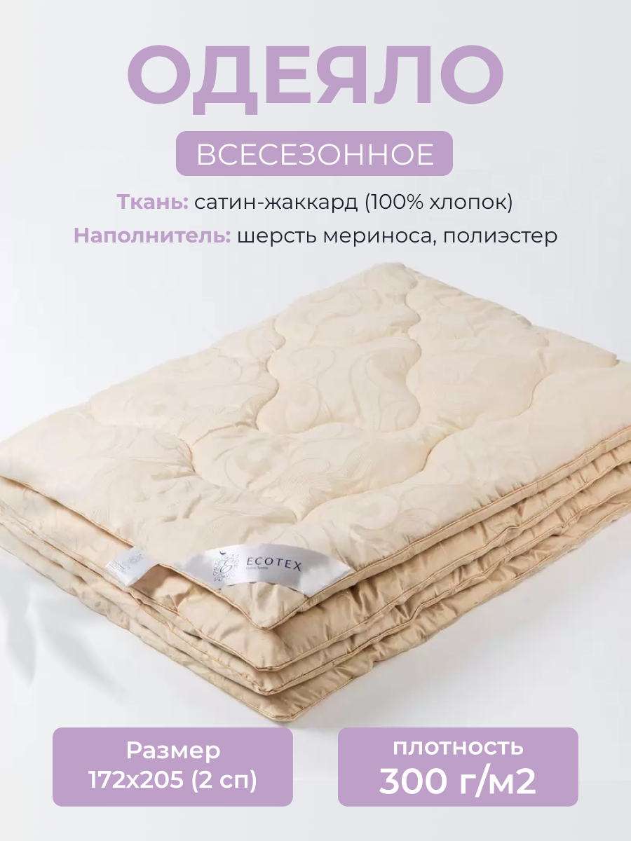 Одеяло ECOTEX Меринос, всесезонное, 172 х 205 см, бежевый