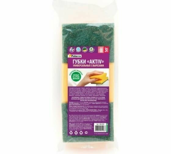 Губки для посуды PATERRA Aktiv 3шт 65 85 44мм с вырезами