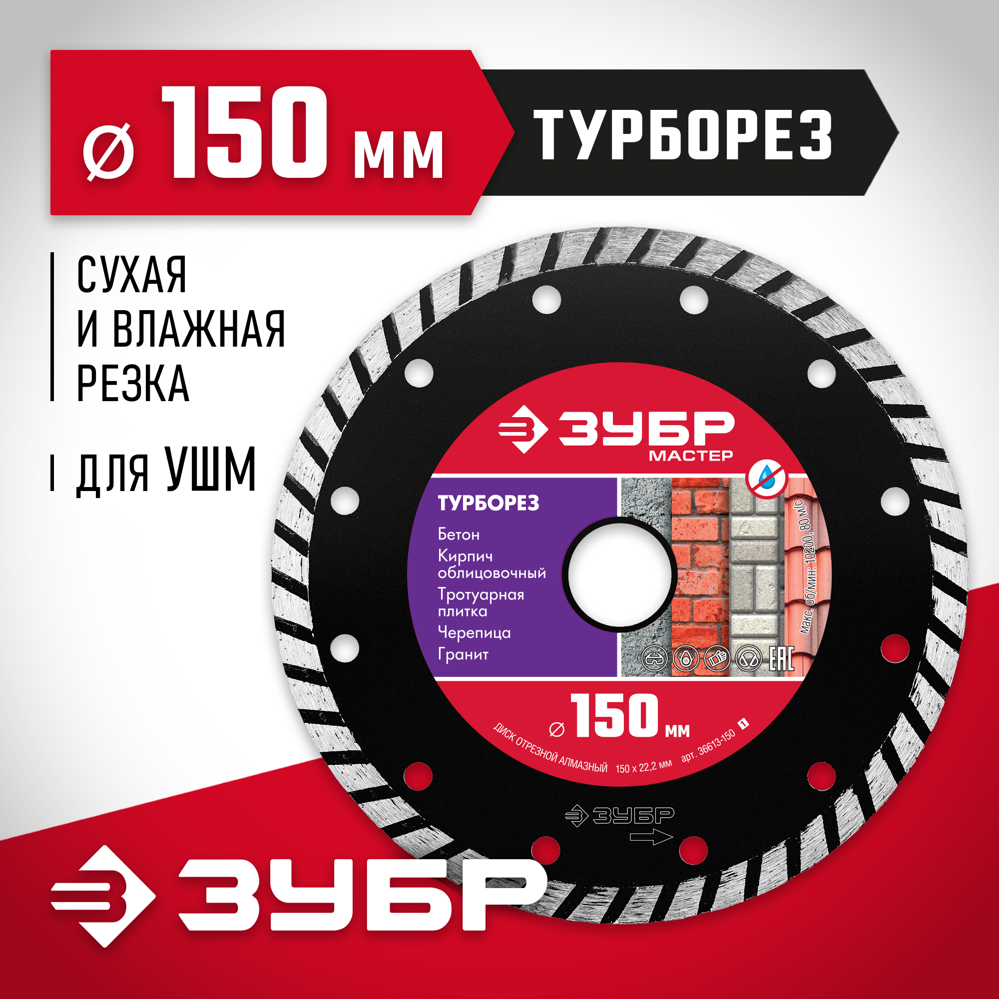 ЗУБР турборез 150 мм, диск алмазный отрезной сегментированный, бетон, кирпич, плитка, черепица, гранит (150х22.2 мм, 7х2.4 мм), (36613-150_z01)