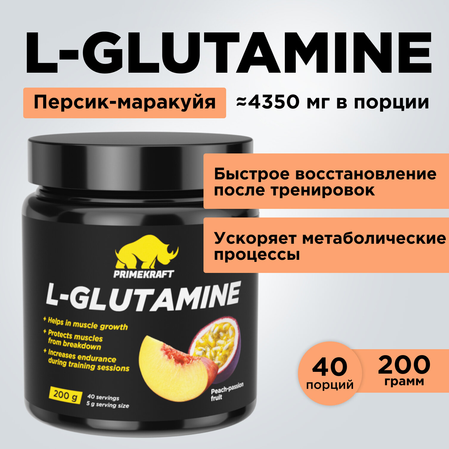 Аминокислоты PRIMEKRAFT Глютамин L-Glutamine Персик-маракуйя, 200 г / 40 порций