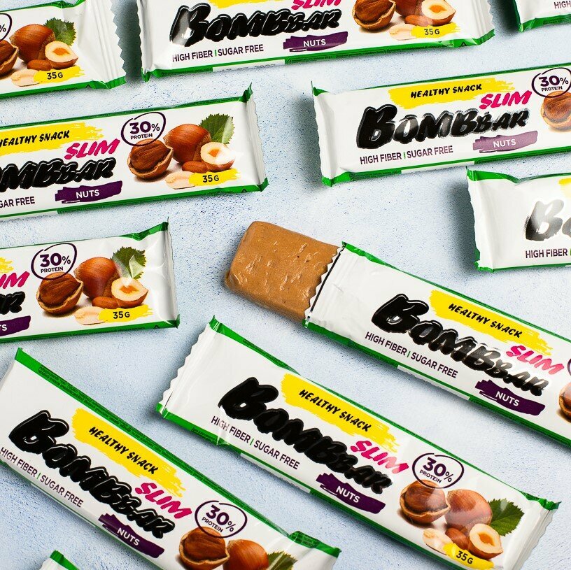 Протеиновые батончики Bombbar Slim без сахара "Фундук Арахис", 30шт х 35г