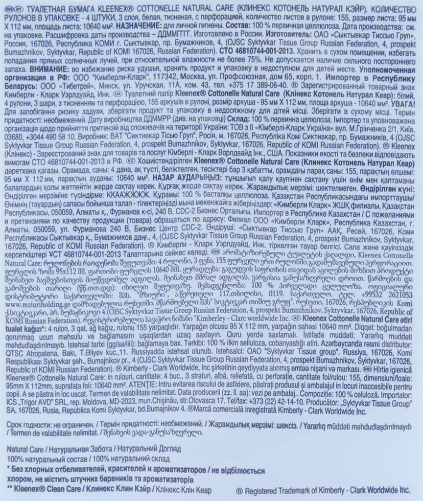 Туалетная бумага трехслойная Kleenex Natural Care 4 рулона