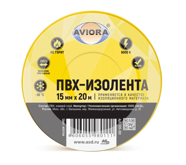 Изолента AVIORA ПВХ, 15 мм, 20 м